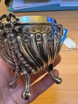 Some dents to the body of the silver, rubbed and with wear, losses to the decoration. Silver polish remnants.