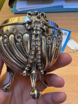 by William Comyns, London, date marks worn, with a domed cover, mounted with ribbons and husks, on three claw and ball feet, 12cm high