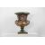 of campana shape, painted to each side with vases and flowers on a green ground enclosed in gilt bands, with twin scroll handles, raised on a square base bearing a spurious painted mark beneath