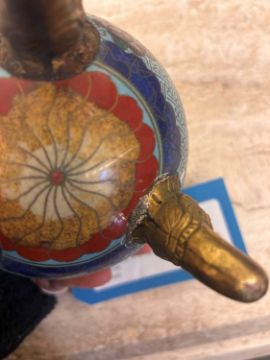 Condition Report: The pair of vases have rusted, dents, and scratches to the surface. Dirt and dust to the surface. The cloisonne with some pitting to the surface. The handles both loose and twisted. Some join marks on the legs and handles. Tarnishing to the legs and white residue around the base. Some marks to the surface and dirt - could benefit from a clean. Some losses to the cloisonnne. Dents to the rim.