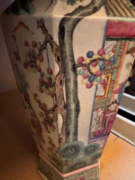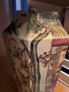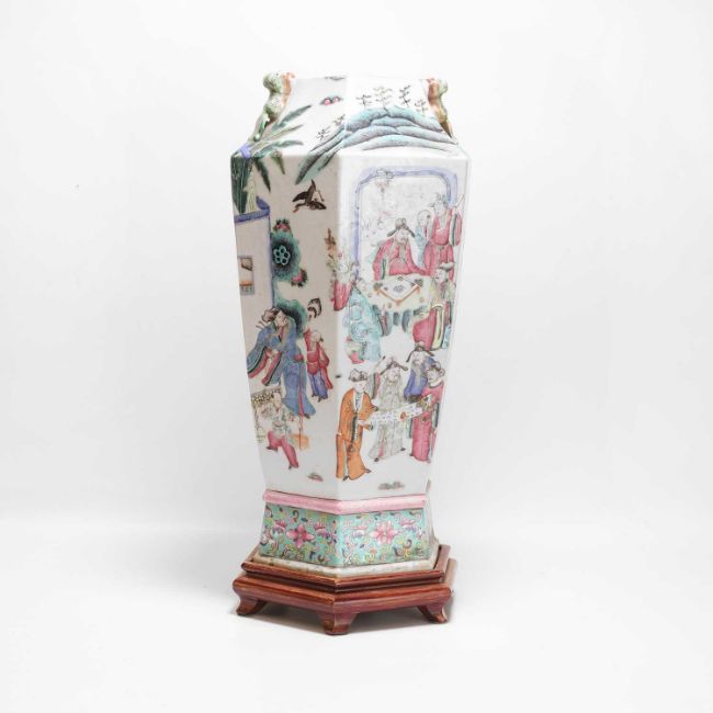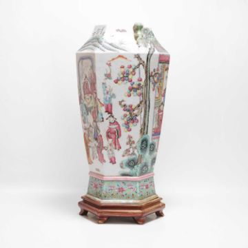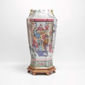 of hexagonal form, painted with figures in a pavilion, flanked by a pair of Buddhist lion handles, converted for electricity,