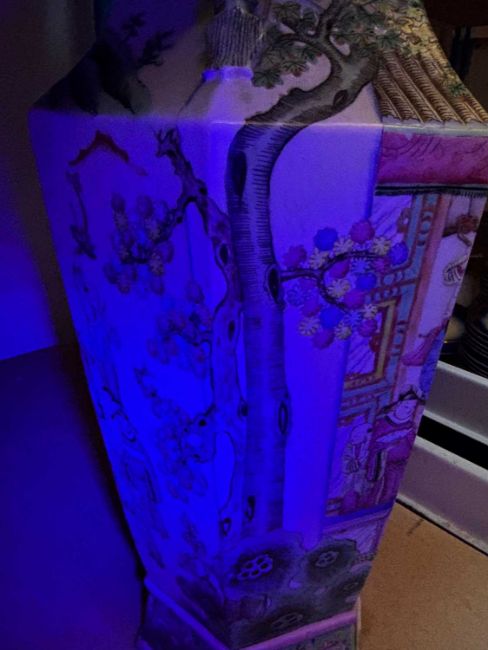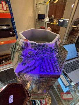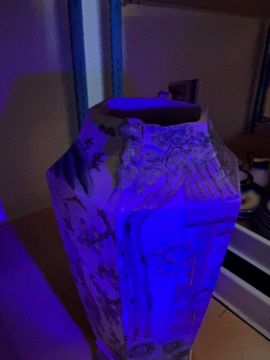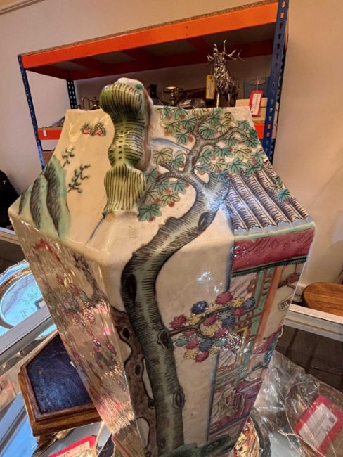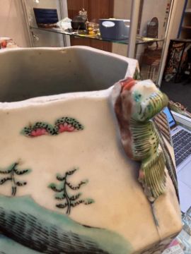 Condition Report: Heavily reduced to the top, has been done unevenly and left small stress cracks to the lower areas of removal, areas of repainting and re glazing, losses throughout notable to the base of one of the ex handles or added motifs to the top.