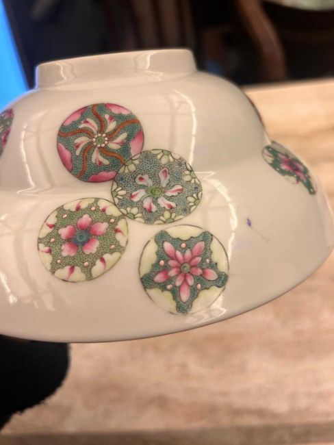 Decorated with clusters of enamelled overlapping roundels of flowerheads, with an underglaze blue four character mark to base
