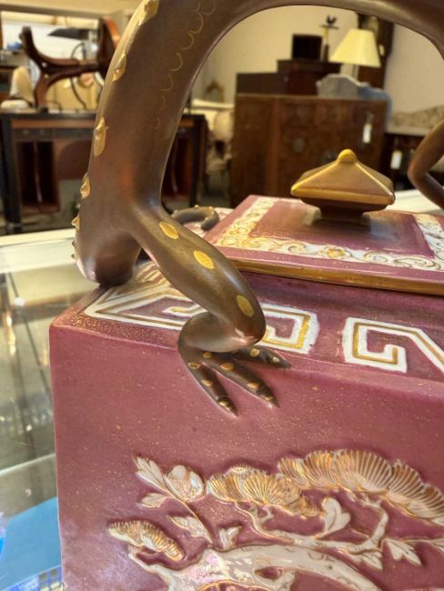 Of cuboid form, the handle modelled as a dragon, with raised details, gilt, and with a puce body, raised lozenge mark for January 18, 1872