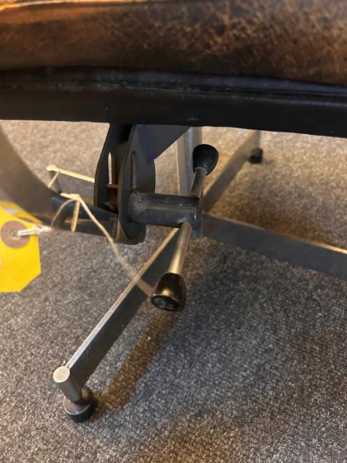 With heavy wear, losses and stitching coming apart on the base cushion. The adujustable lever for the back rest does work but is very stiff. The height lever does unwind but does not move the height of the chair unless really pulled - it is very stiff and very hard to move. The cushion open at the front, revealing the cushion's interior. Knocks and scratches to the legs and base. See additional images.