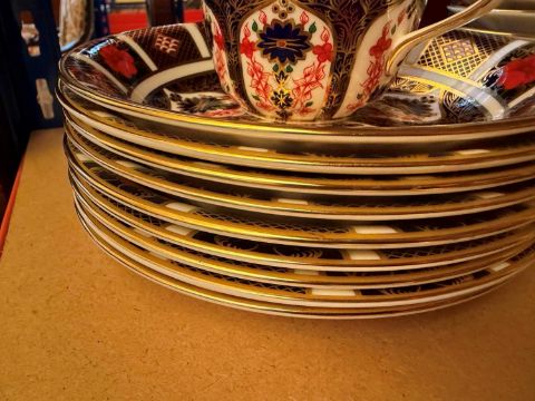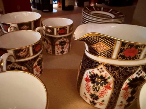 comprising a coffee pot, twin handled covered sugar bowl, creamer, another sugar bowl, ten coffee cans, and saucers, twelve breakfast cups and saucers, ten shallow berry dish/saucers, each decorated in imari, with printed and painted marks