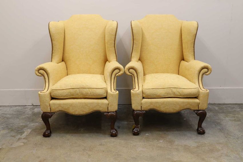 upholstered in yellow damask fabric, raised on claw and ball feet, the vestigal with saddlt-cheek wings