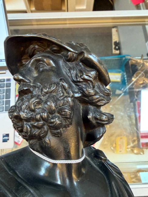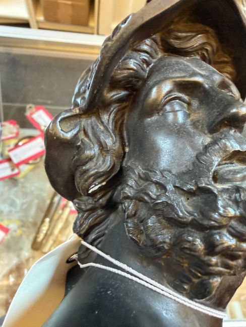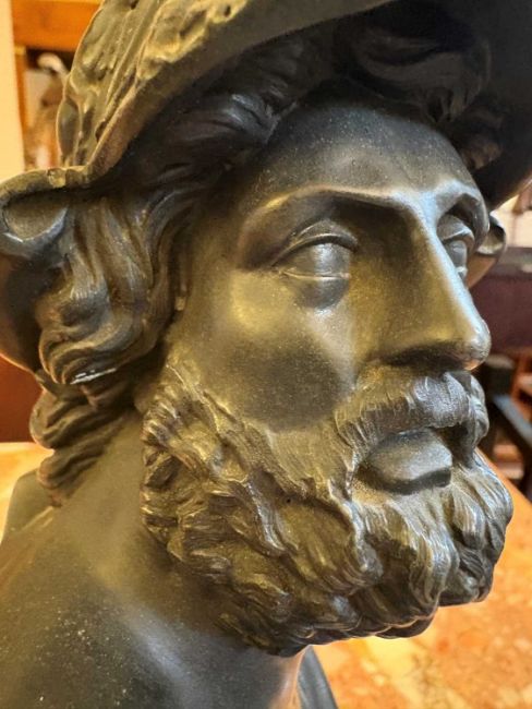 modelled as the bust of a bearded male figure wearing a crested helmet decorated with figural ornament, his head turned to dexter, the figure depicted with flowing hair and beard, wearing draped armour across the shoulders, raised on a circular socle and square base, bronze with a dark brown patinated finish