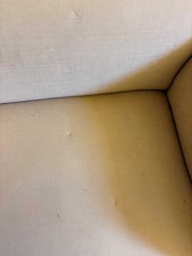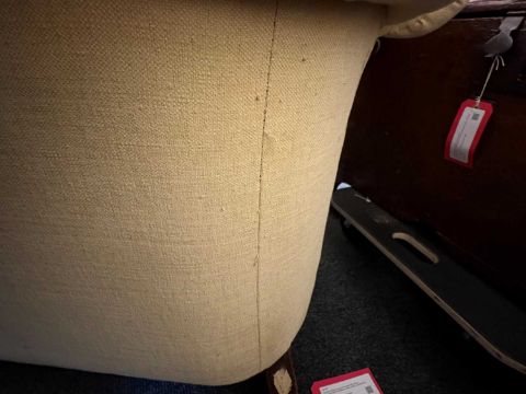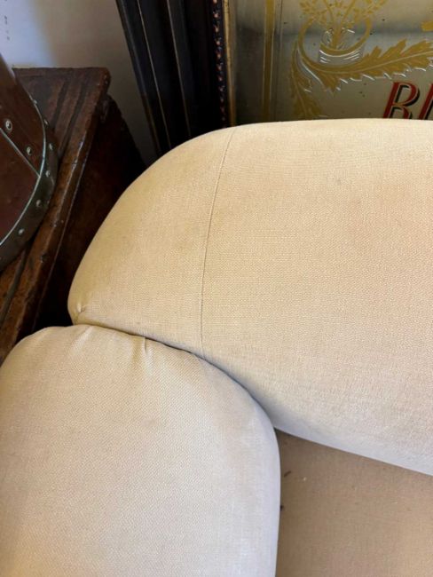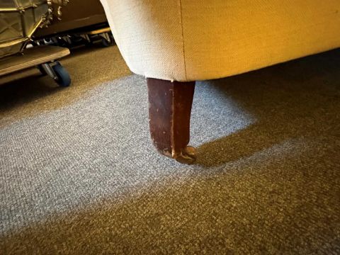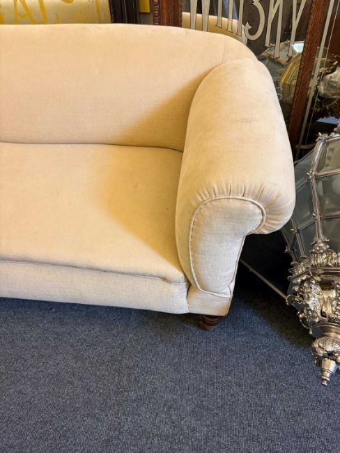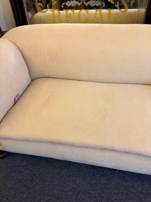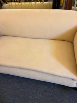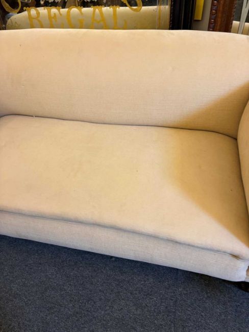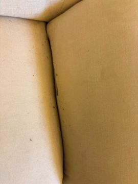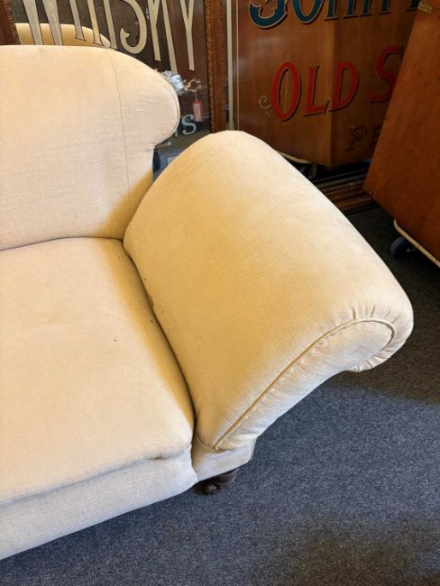 Drop arms function. The sofa is sturdy, usable, and quite springy. The upholstery fabric with some minor marks, to the folds of the sofa there is detritus, would benefit from cleaning. legs with knocks and wear commensurate with age and use.