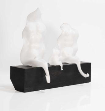 'Famiglia di Foglie', three carved alabaster nude figures, on a wood plinth,