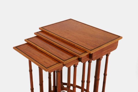 each rectangular top raised on ring-turned supports united by stretchers, terminating in splayed feet, bearing maker's label beneath