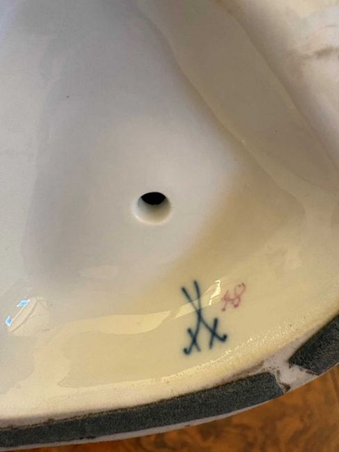 Small chip to one of the flowers. Nibble/ small chip to one of the frills on the sleeves. Harlequin with hairline crack to one of the hands. Baize-covered underside.